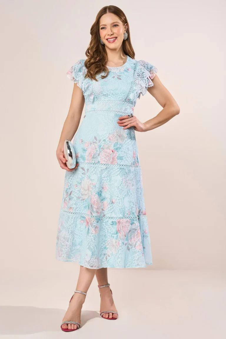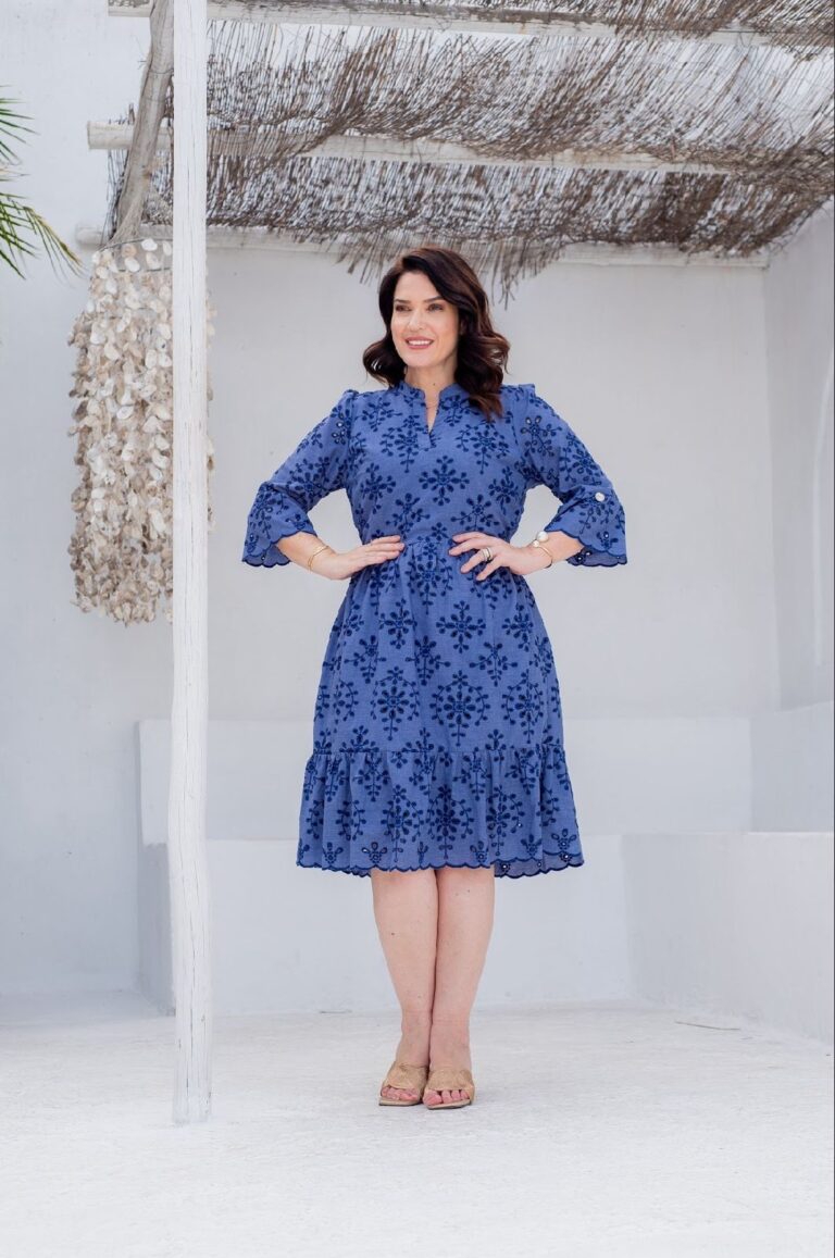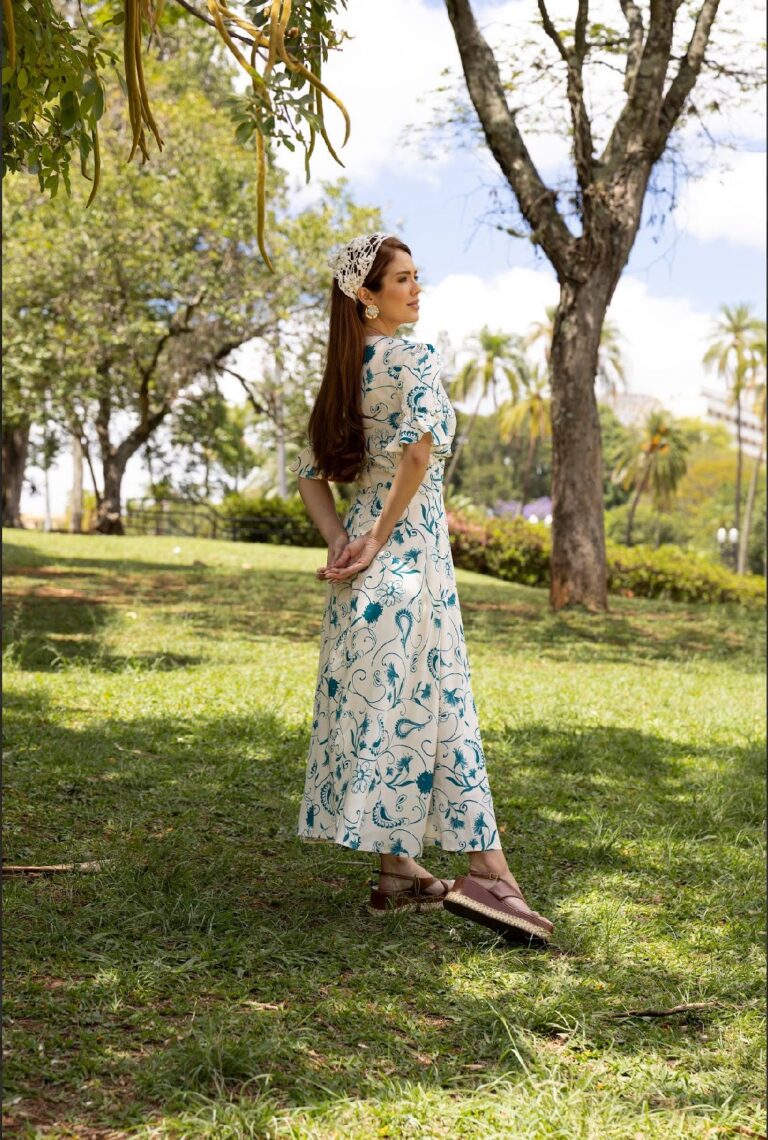Vestido Azul Com Estampada Floral Exclusiva Evasê Midi Fascinius