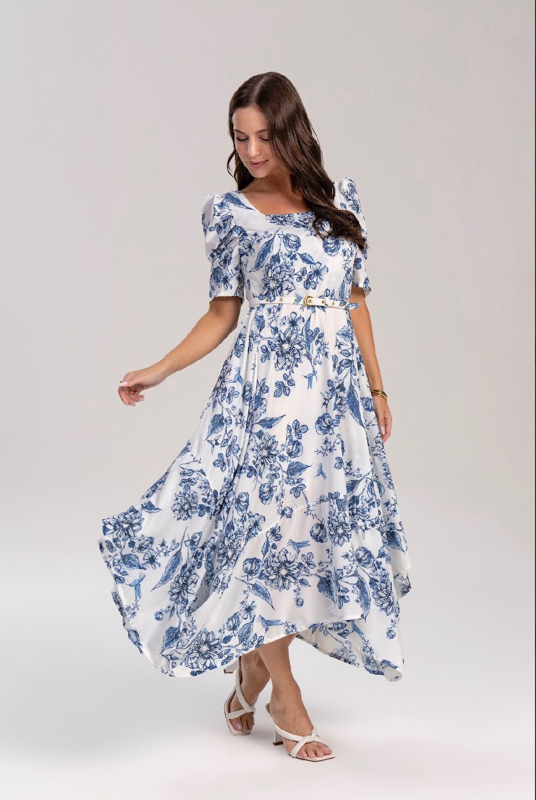 Vestido de crepe com estampa corrida confeccionado em tecido de altíssima qualidade, cor de linha : palha, aviamentos em banho metalizado dourado, fechamento traseiro em zíper, mangas levemente bufante, decote quadrado e detalhe de babado assimétrico, comprimento de 1,15cm.