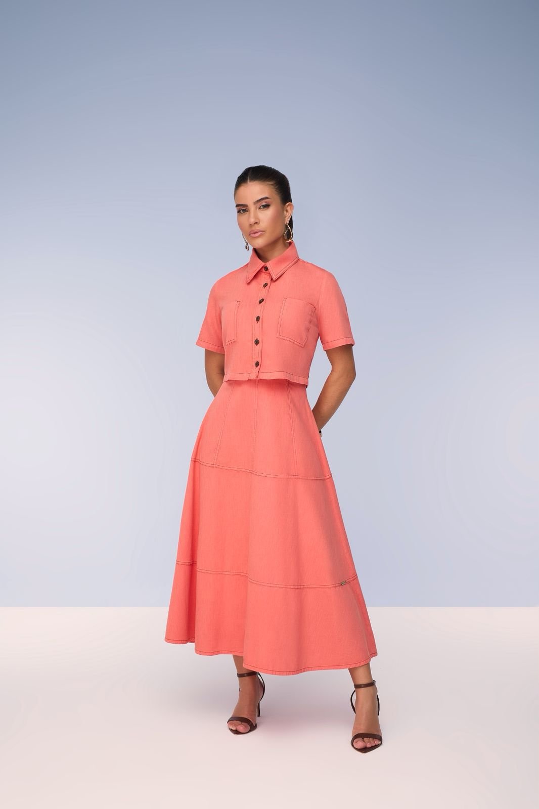 Camisa Tïtanium desenvolvida em tecido de Sarja leve Sustentável em lavanderia tingida na moderna cor Coral é tendência da estação. Em modelagem curta e solta a peça oferece uma produção fashionista com conforto. Possui bolsos frontais funcionais e fechamento frontal em botões naturais que destacam a produção. Apresenta aviamentos em banho metalizado Ouro e cor de linha Marrom. Essa peça faz parte da linha sustentável e foi confeccionada através de técnicas de produção que minimizam significativamente o uso de água durante seu processo de criação. Uma peça encantadora que combina graciosamente com a saia de mesma proposta oferecendo um conjunto moderno para passeios, cultos e ambientes que você queira estar ainda mais bela e notável.