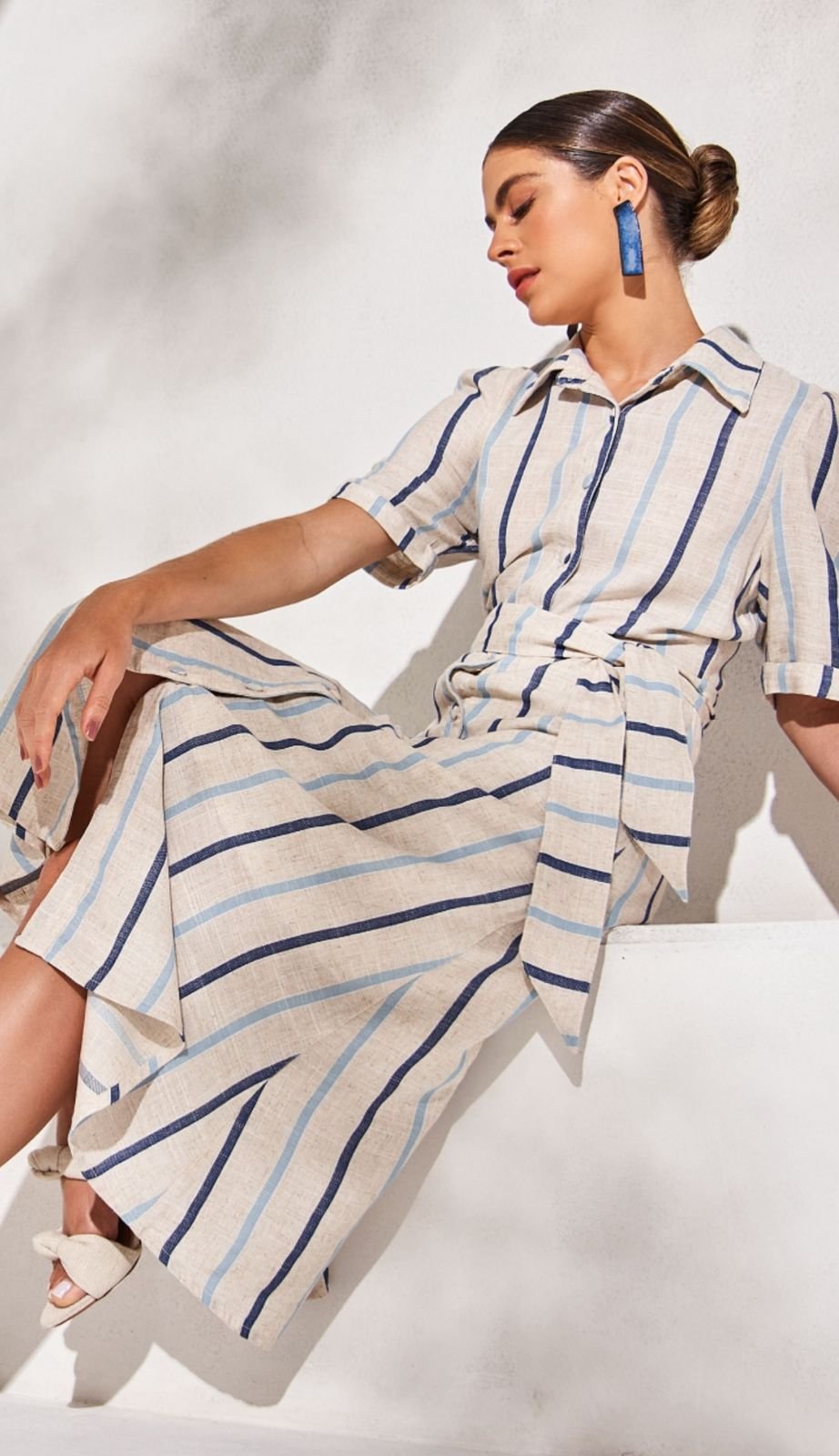 uma peça que une o charme clássico do linho às tendências atuais. Confeccionado em tecido de linho listrado de alta qualidade, este chemise é perfeito para quem busca um visual elegante e moderno em qualquer ocasião.