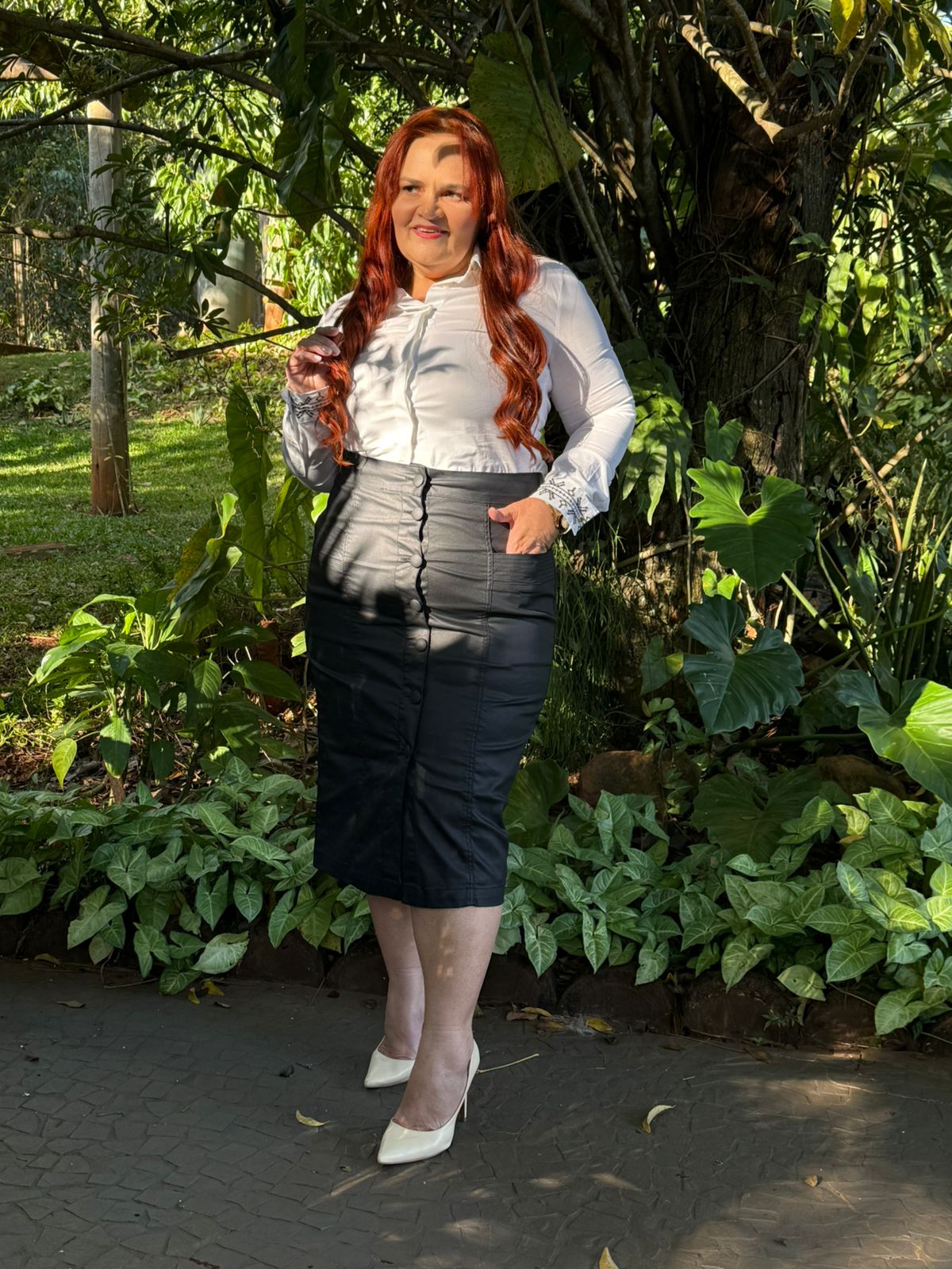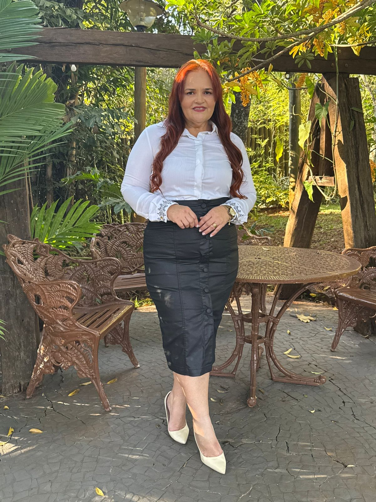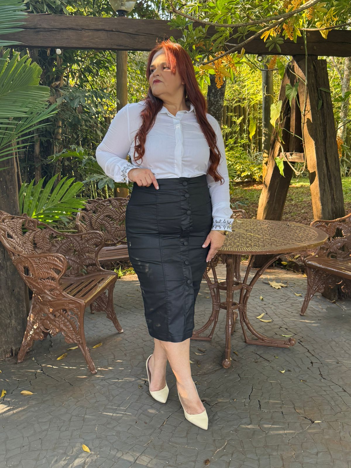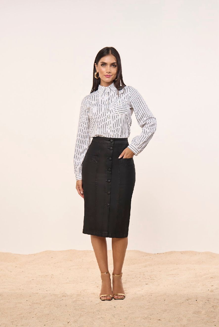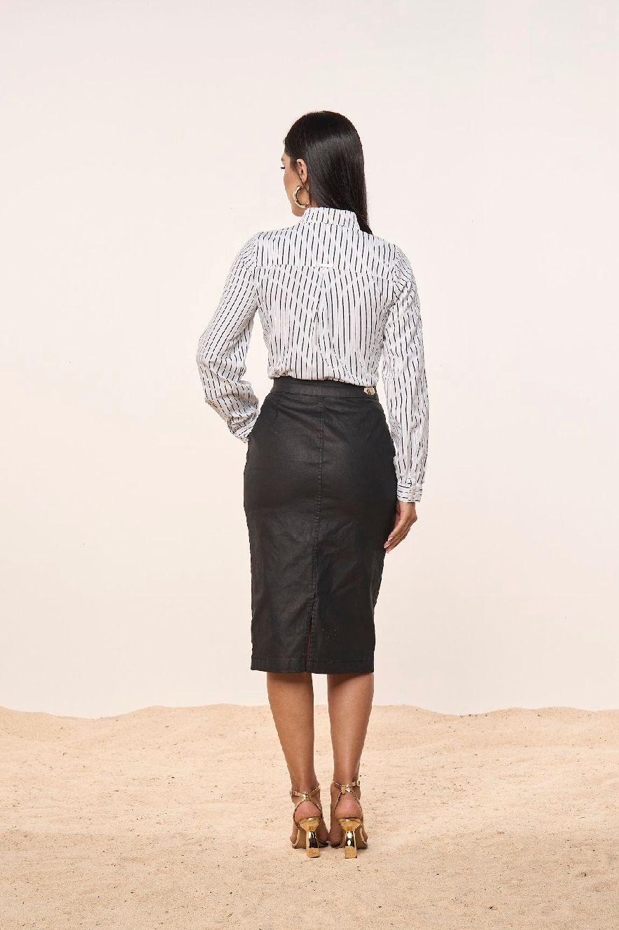 Saia resinada preta, bolsos funcionais, botões funcionais.