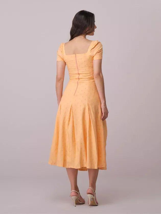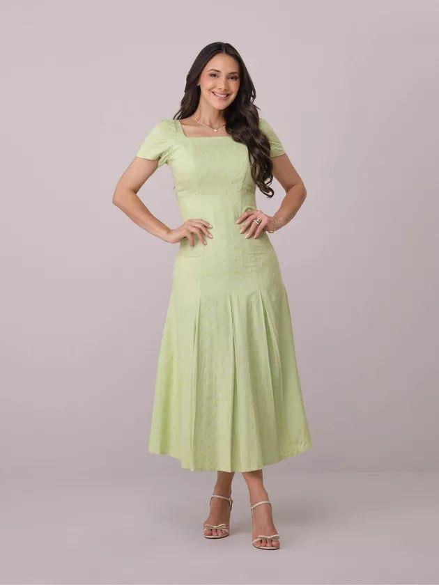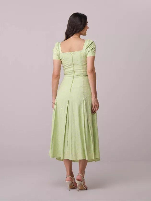 Vestido Ariana – Tata Martello – Confeccionado em linho bordado, com caimento elegante e textura refinada. Possui modelagem midi acinturada, decote quadrado estruturado, mangas curtas com franzido, saia com pregas que garantem movimento, fechamento em zíper posterior e forro interno, unindo leveza, feminilidade e sofisticação.