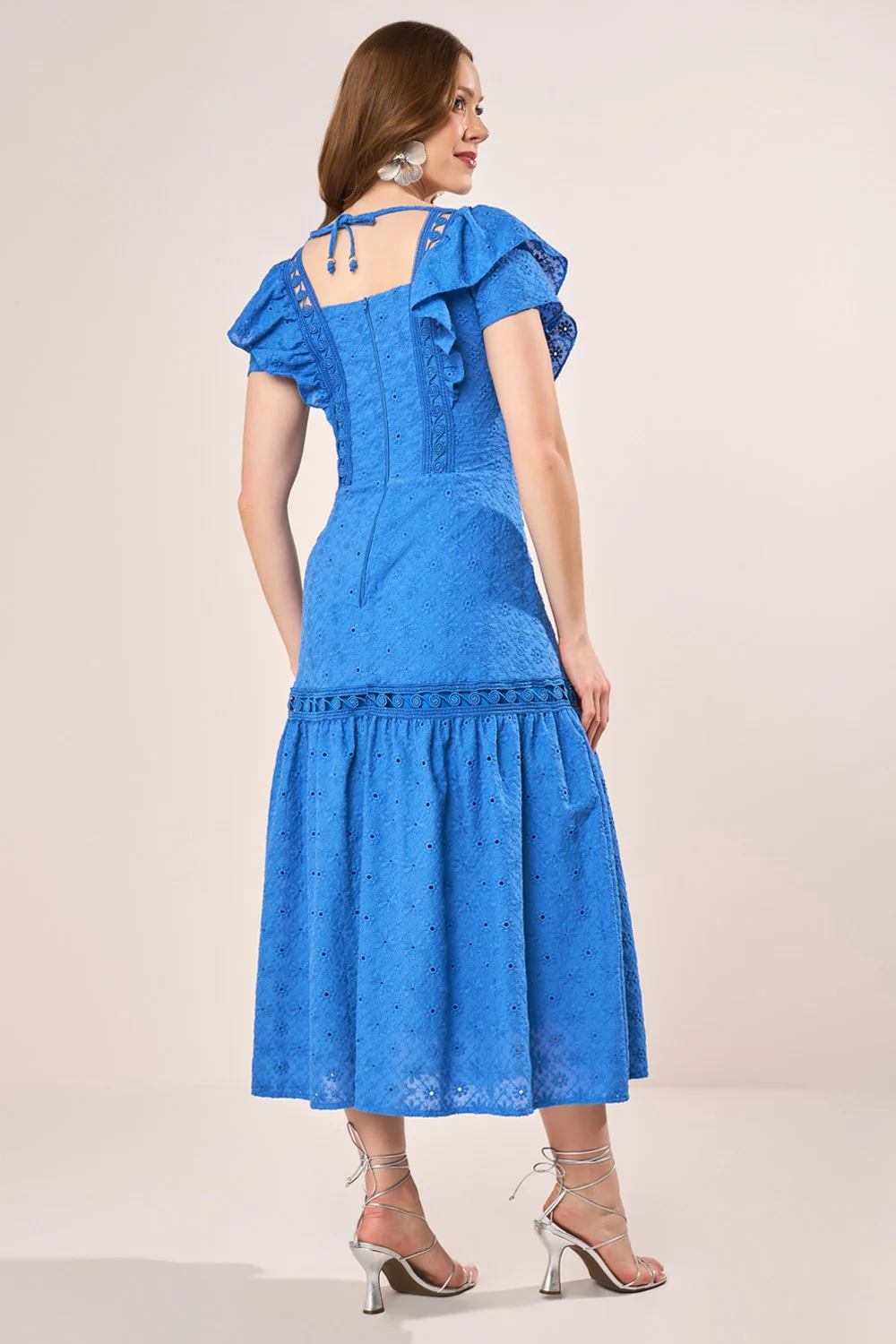 Vestido Azul Em Laise Com Guipir E Babados Evasê Midi Fascinius