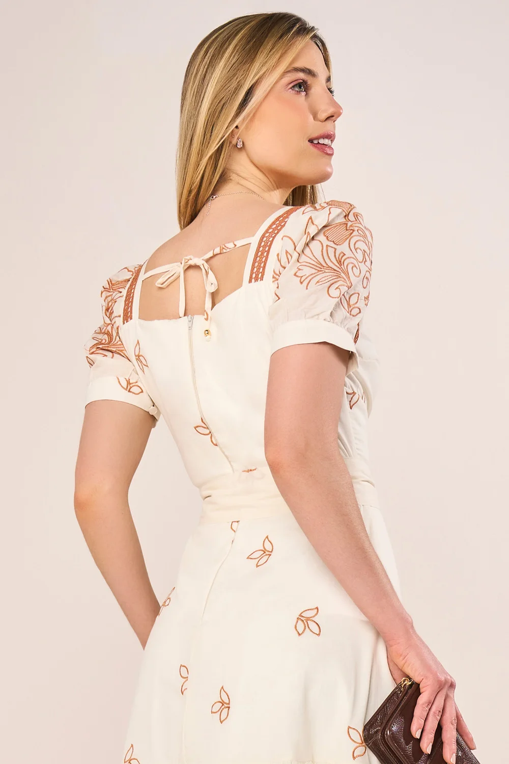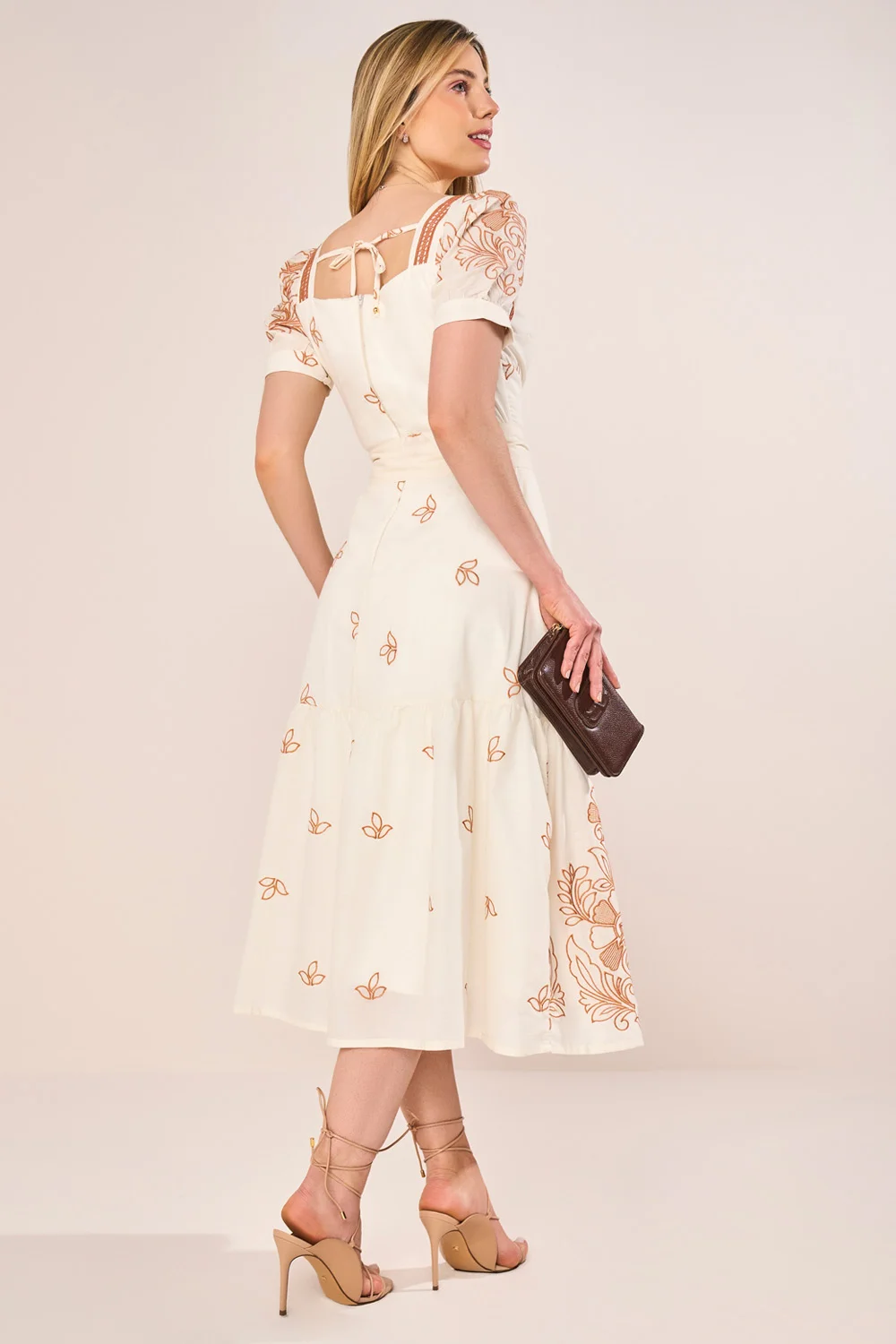 Vestido Caramelo Com Bordado E Guipir Godê Midi Fascinius