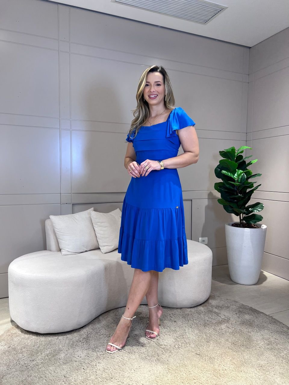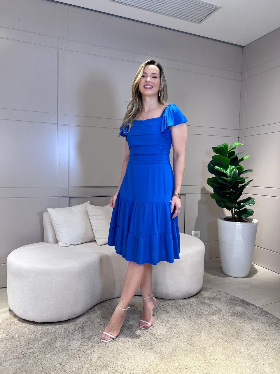 vestido em viscose com pregas no busto, a escolha ideal para quem busca elegância e conforto em uma peça versátil. Confeccionado em viscose leve, proporciona toque macio e caimento perfeito, garantindo frescor nos dias mais quentes. As pregas estruturadas no busto valorizam a silhueta, enquanto a saia com babados adiciona movimento e charme ao look. Seu design com manga curta e decote reto oferece sofisticação discreta para ocasiões casuais e eventos sociais.