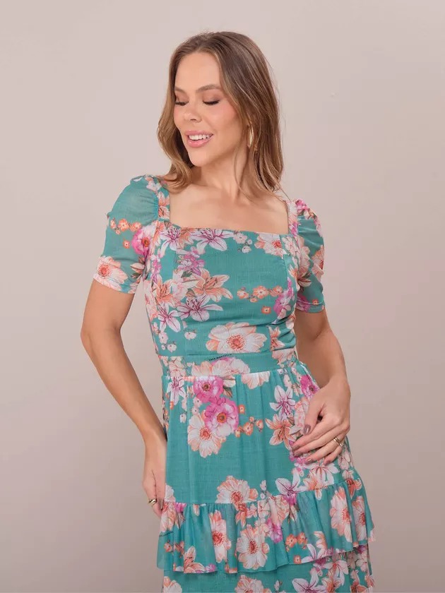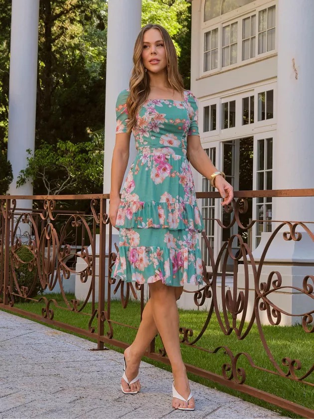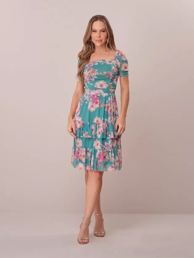 Curto, feminino e fresco, o Vestido Flora é confeccionado em tule estampado de toque leve, com estampa floral vibrante que acrescenta romantismo na medida. A modelagem levemente evasê valoriza a silhueta com cintura marcada por lastex posterior, decote quadrado confortável e mangas curtas com leve volume e elástico para caimento perfeito. A saia em camadas com babados franzidos garante movimento elegante, enquanto o forro assegura discrição e conforto — uma peça delicada e sofisticada para iluminar produções do dia a dia e ocasiões especiais