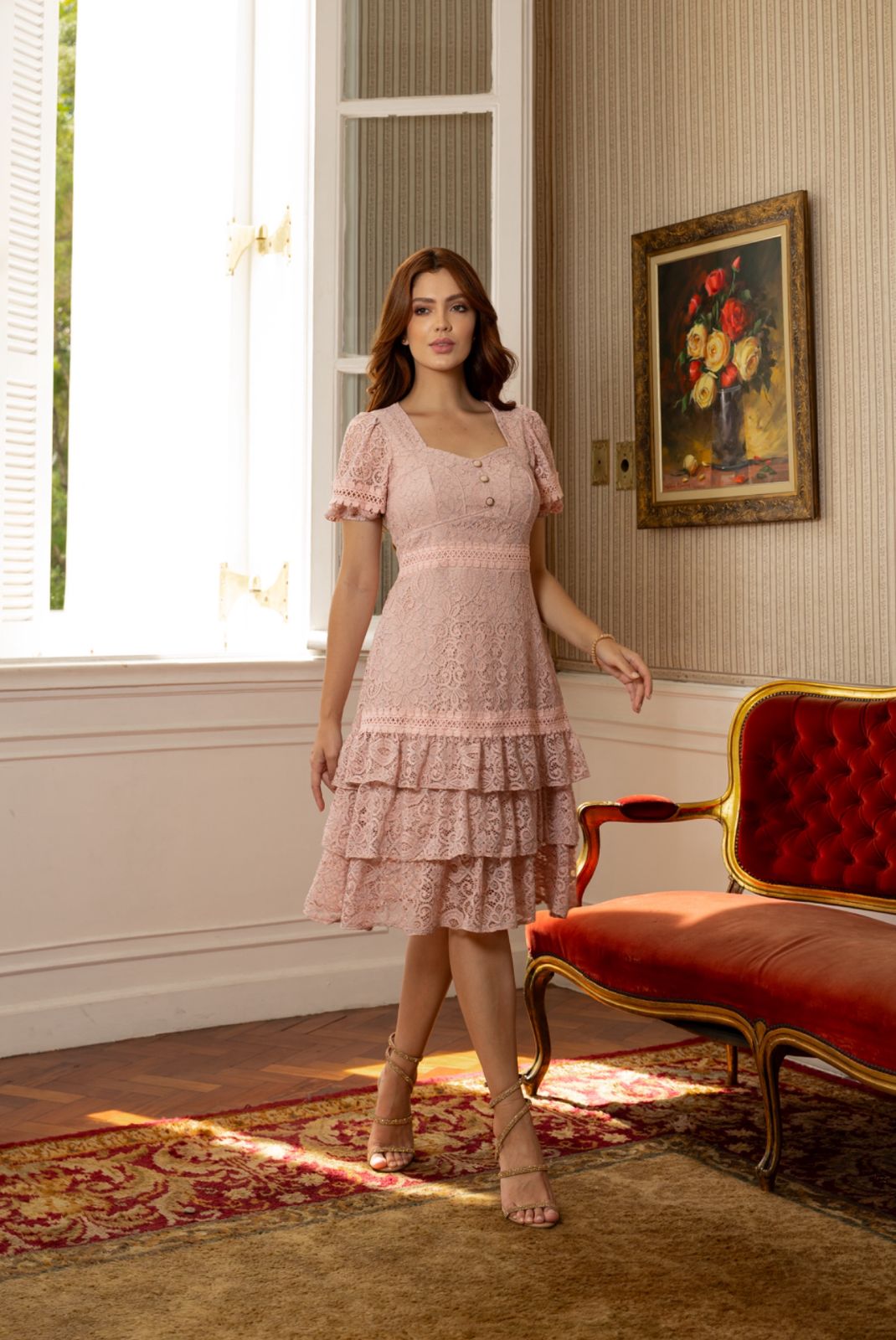Vestido na Renda trabalhada e forrado com sedinha, possui decote coração com aplicação de botões não funcionais e recortes no busto, possui manga princesa com aplicação de renda guipir no punho, possui aplicação de renda guipir na tala da cintura e na saia, possui saia no modelo evasê com aplicação de 3 camadas de renda possui zíper nas costas, possui forro.