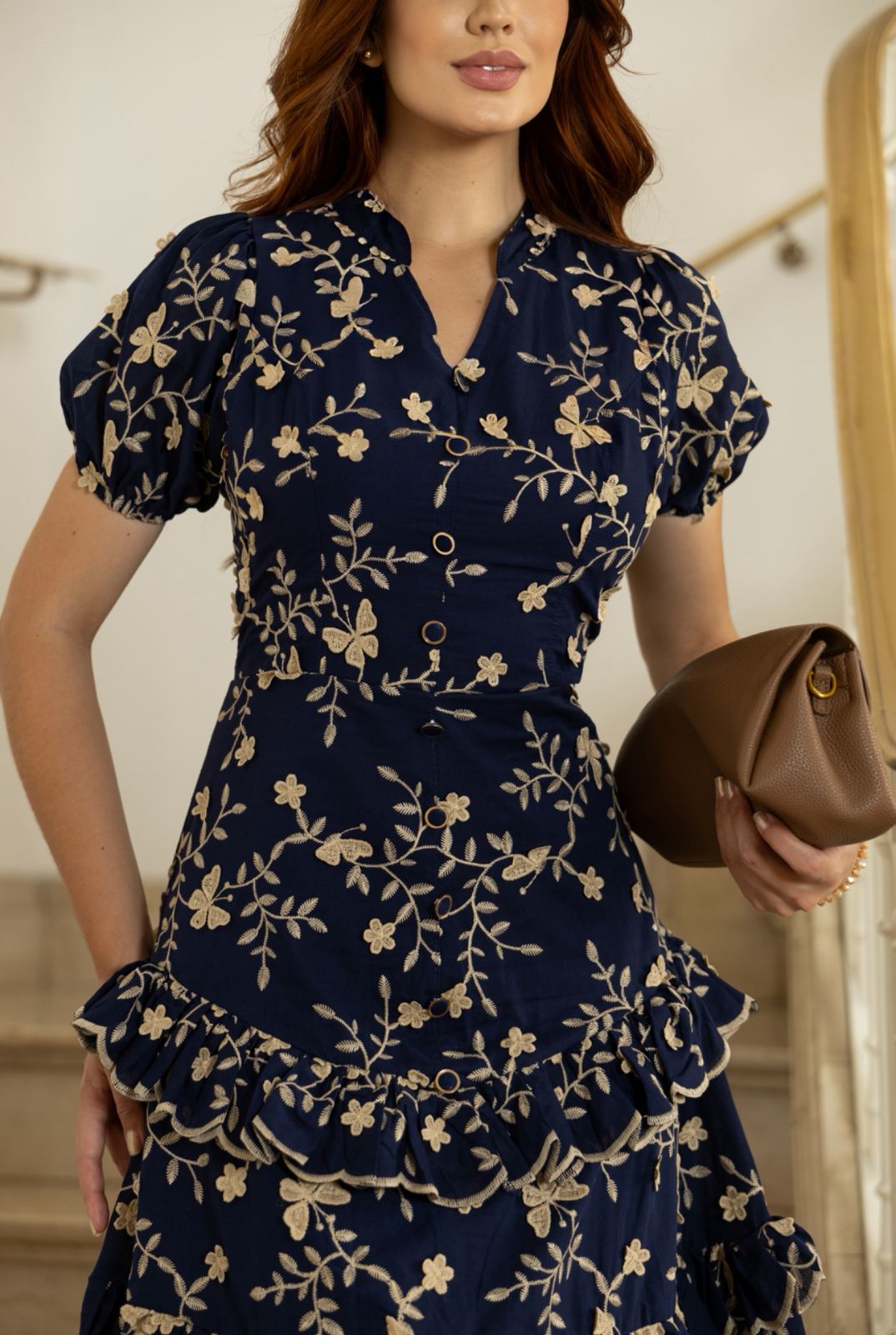 Vestido no modelo midi na cambraia bordada 3D, possui gola padre e decote em “V” e aplicação de botões ecapados não funcionais no busto até a saia, possui manga curta levemente bufante com aplicação de 2 marias marcadas com babados no mesmo tecido, possui zíper nas costas, possui forro.