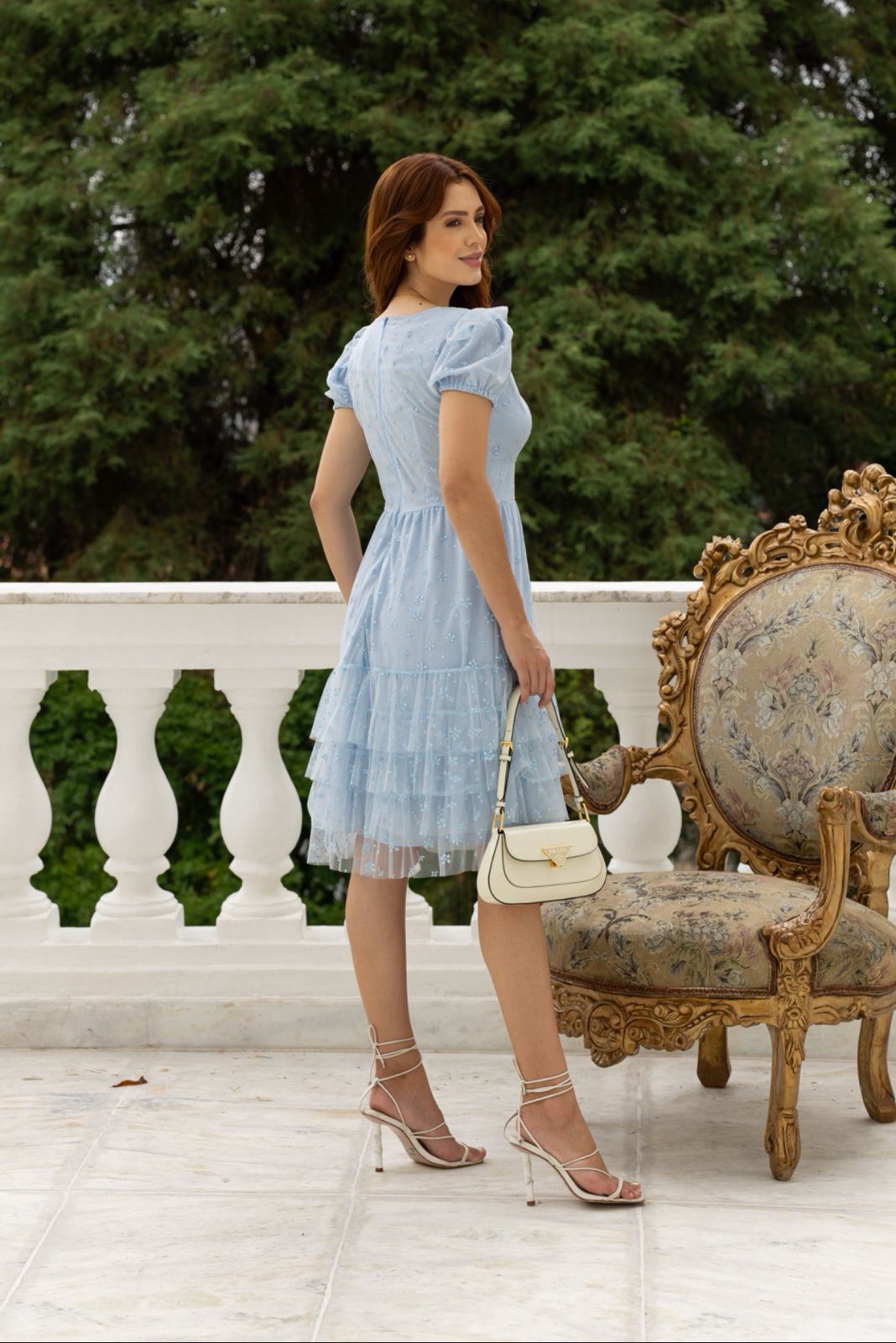 Vestido Lady Like no tule trabalhado com flores e forrado com sedinha, possui decote coração, possui manga princesa com aplicação de elástico no punho, saia no modelo evasê com aplicação de camadas de babados no tule e aplicação de forro, além da sedinha, possui zíper nas costas.