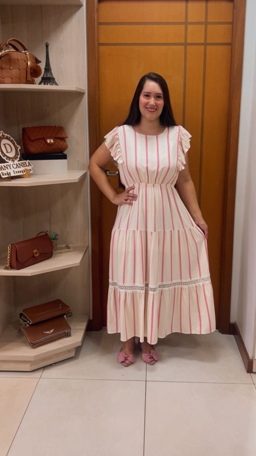 Vestido em viscolinho listrado, com detalhes de guipir, comprimento max midi, possui elastico na cintura tamanho único veste do 38 ao 44