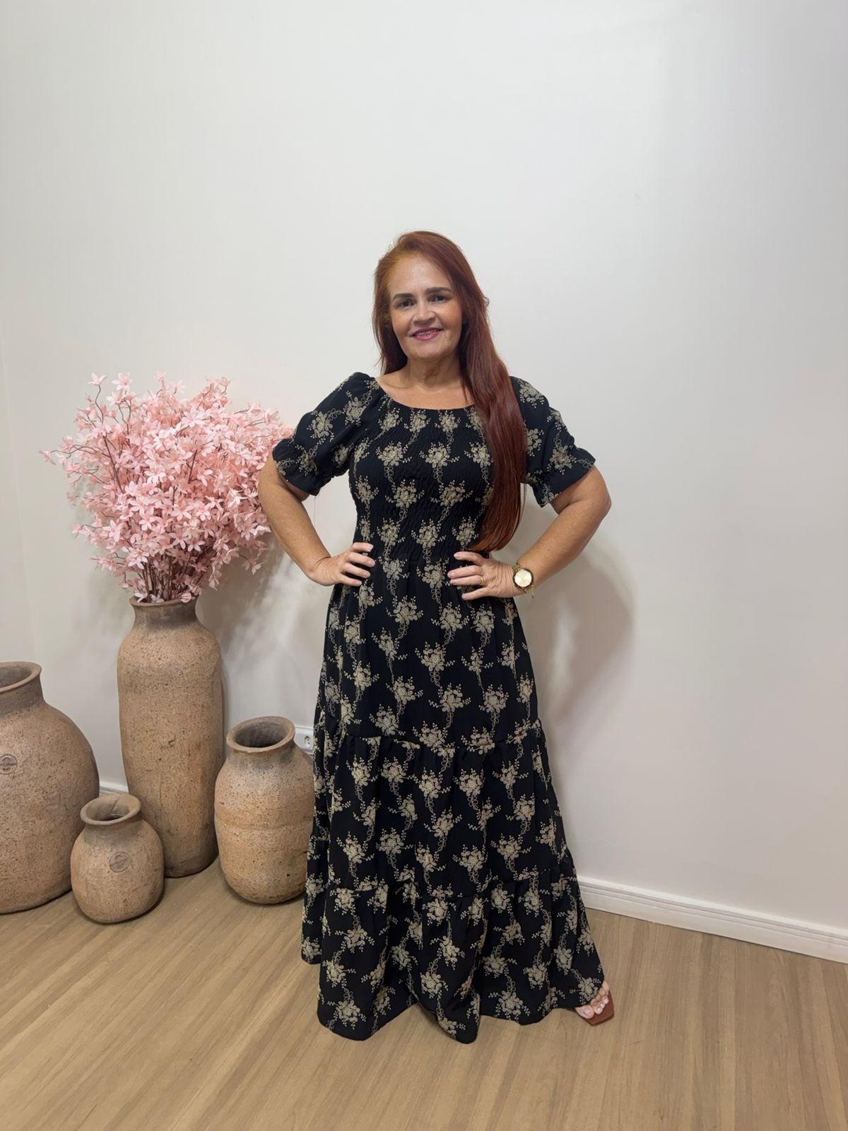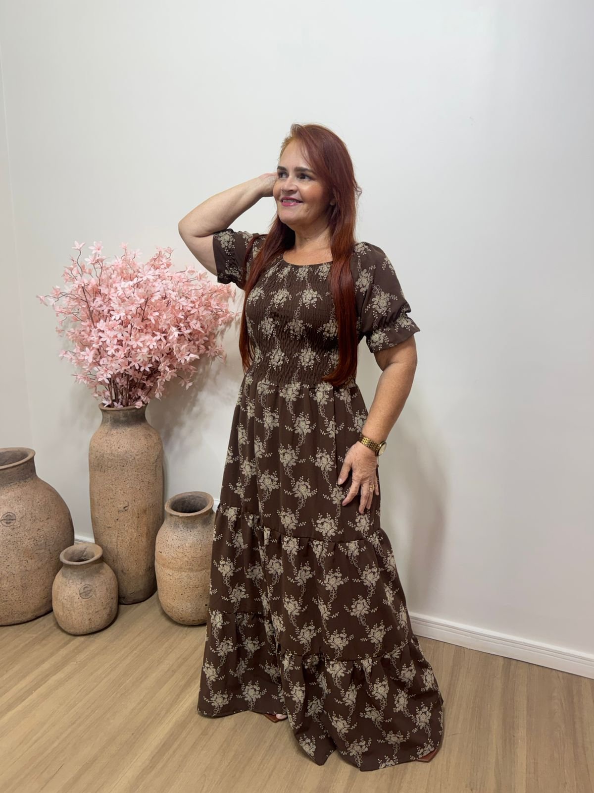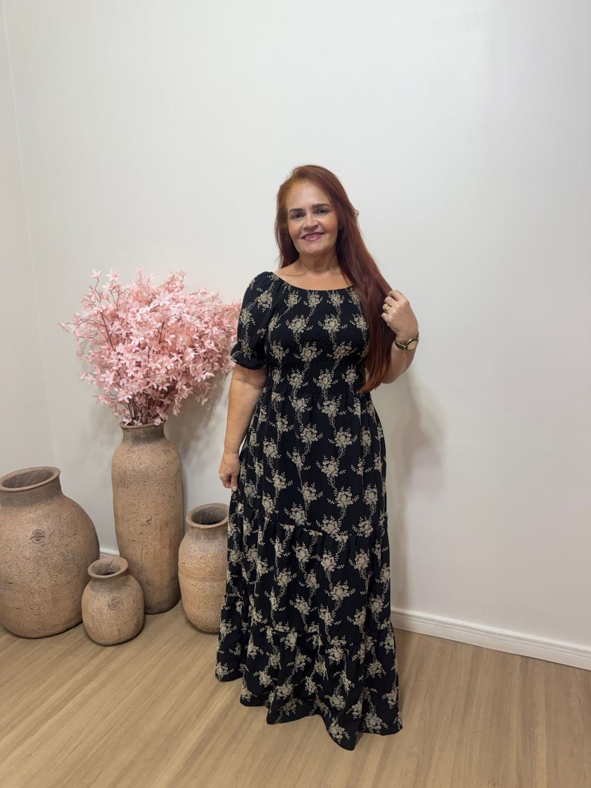 Vestido longo estampado que une elegância e conforto em um só look. Com caimento leve e fluido, ele valoriza a silhueta de forma delicada, trazendo mangas curtas e modelagem soltinha que garante praticidade para o dia a dia ou ocasiões especiais.