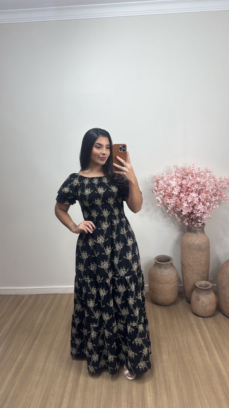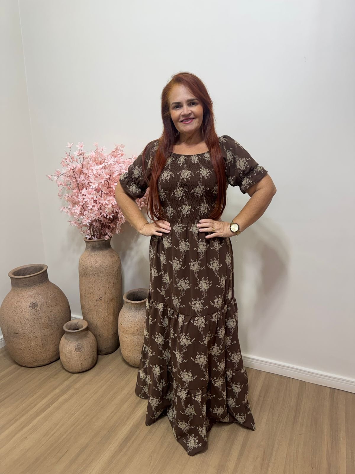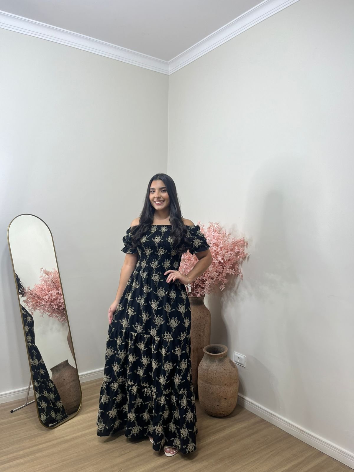 Vestido longo estampado que une elegância e conforto em um só look. Com caimento leve e fluido, ele valoriza a silhueta de forma delicada, trazendo mangas curtas e modelagem soltinha que garante praticidade para o dia a dia ou ocasiões especiais.