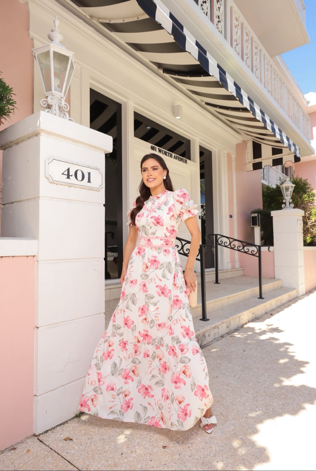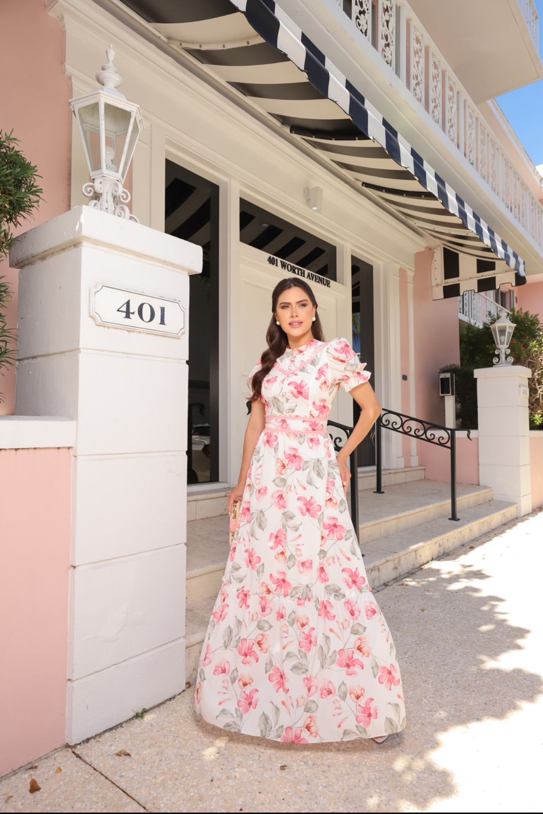 Vestido longo no tecido sedinha estampada floral, possui gola padre com aplicação de botões fakes e renda guipir no busto e na cintura, possui manga princesa levemente bufante com aplicação de lastéx, no punho formando um mini babado na manga, saia no modelo evasê com aplicação de 1 maria, possui zíper nas costas, possui forro.
