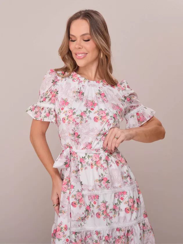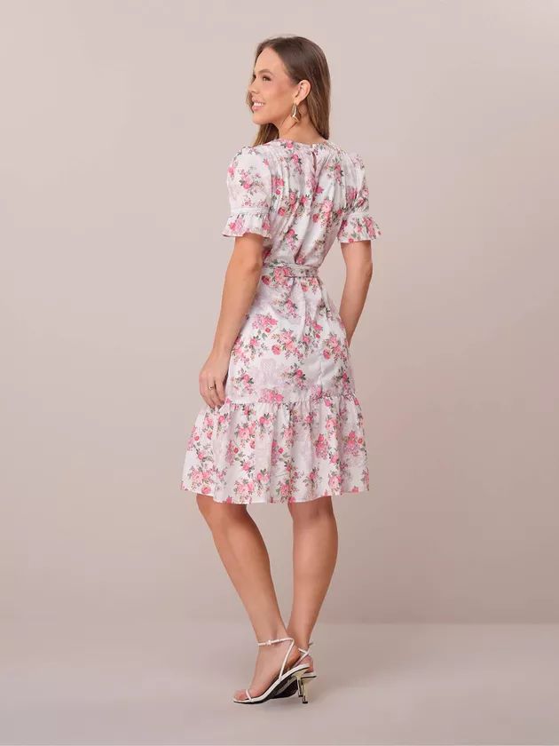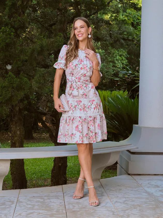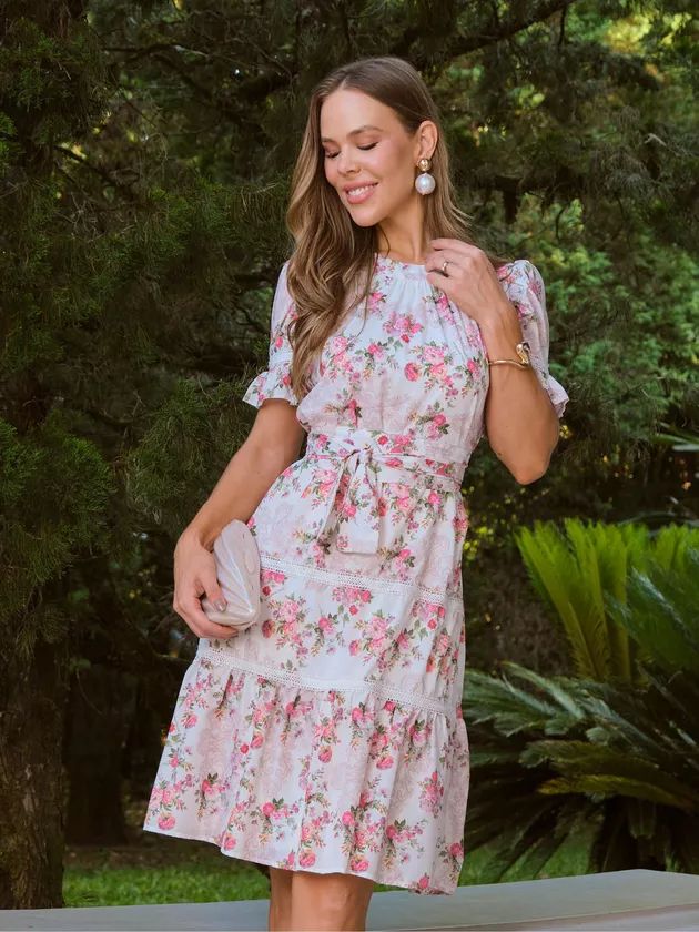 Delicado e romântico, o Vestido Melinda é curto em crepe leve de toque macio e caimento natural, com estampa floral harmoniosa que realça a feminilidade. A modelagem solta, levemente evasê, ganha definição com a faixa ajustável do mesmo tecido, enquanto o decote redondo apresenta franzido suave e fechamento posterior em botão de pezinho com casinha de noiva. As mangas curtas com leve volume e detalhes de renda, somadas às aplicações rendadas e recortes em camadas na saia, criam movimento sutil e um visual refinado. Forro interno assegura conforto e caimento impecável — uma peça que traduz romantismo contemporâneo com elegância.