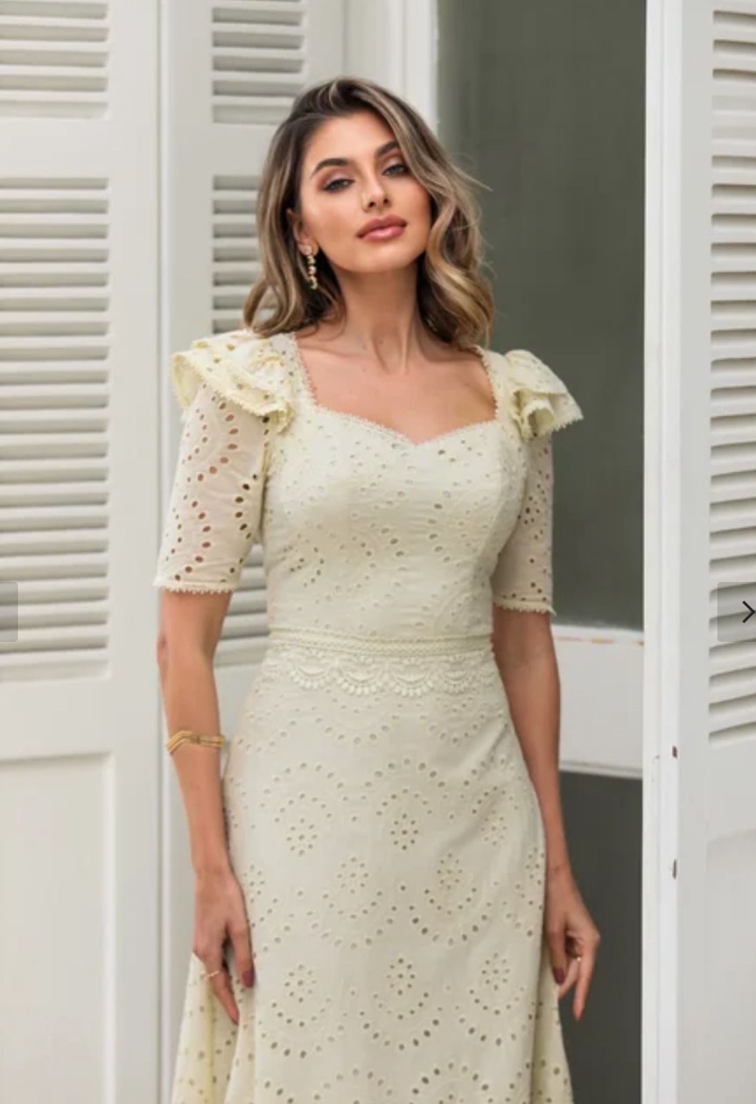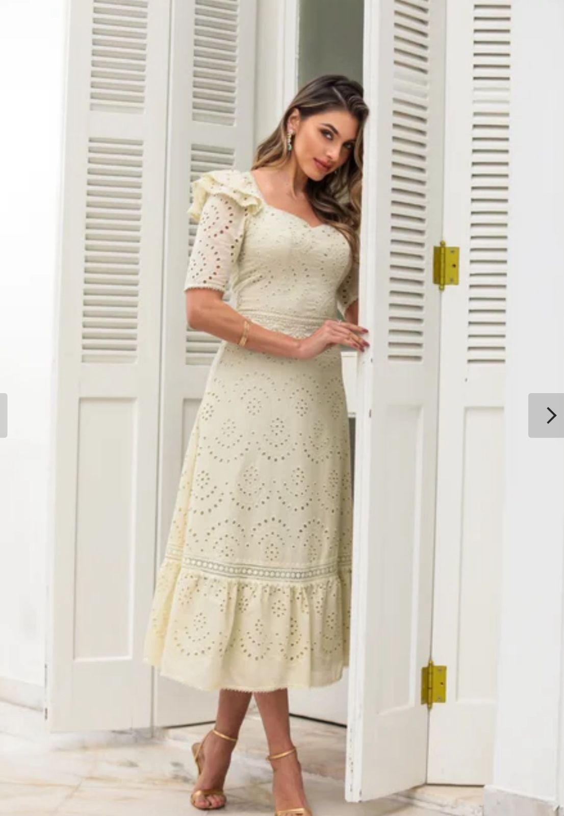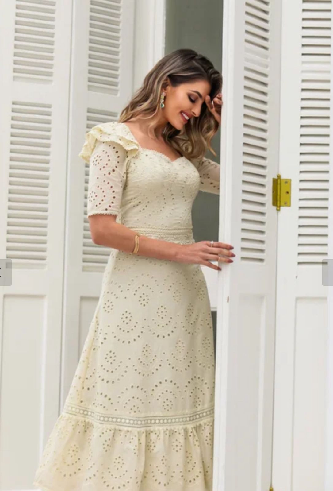 Encante-se com a elegância delicada do nosso vestido midi em laise e guipir, uma peça que combina romantismo e sofisticação em um design impecável. Ideal para eventos especiais ou para dar um toque de charme ao seu cotidiano, este vestido foi criado para destacar a feminilidade com graça e estilo.