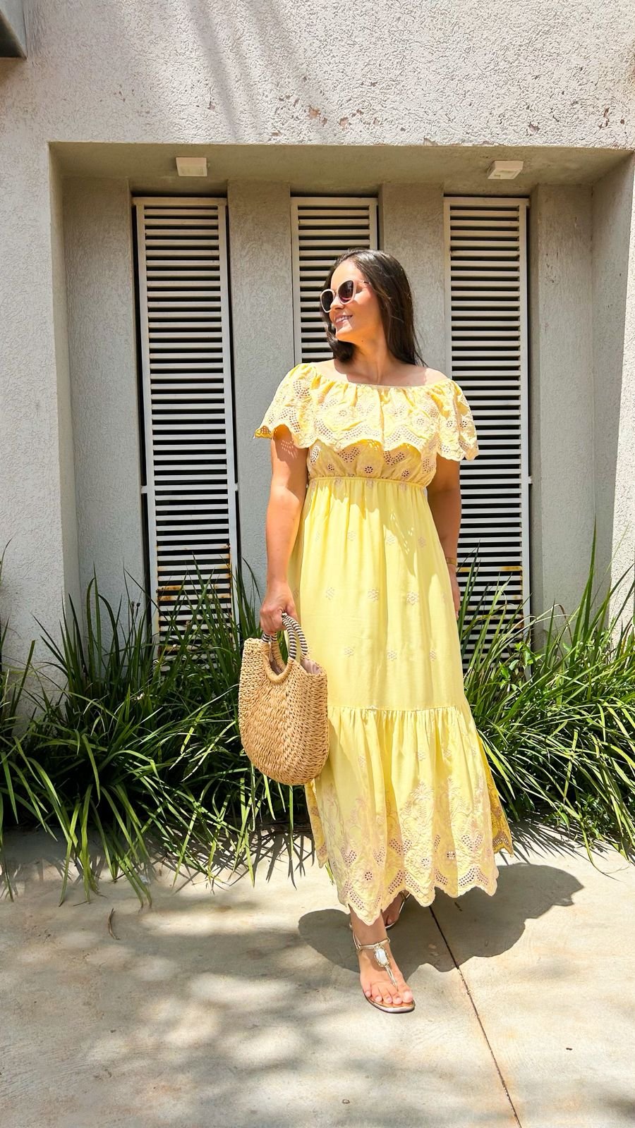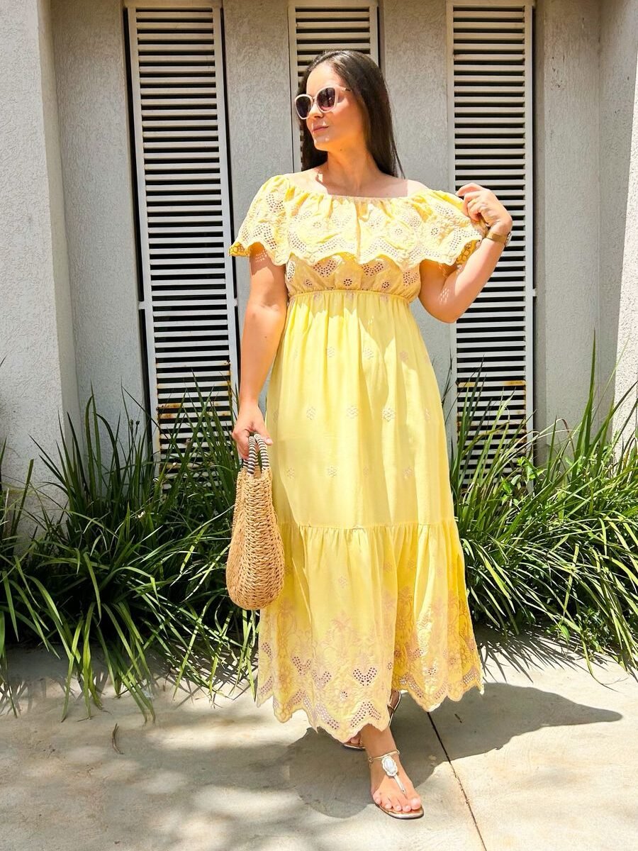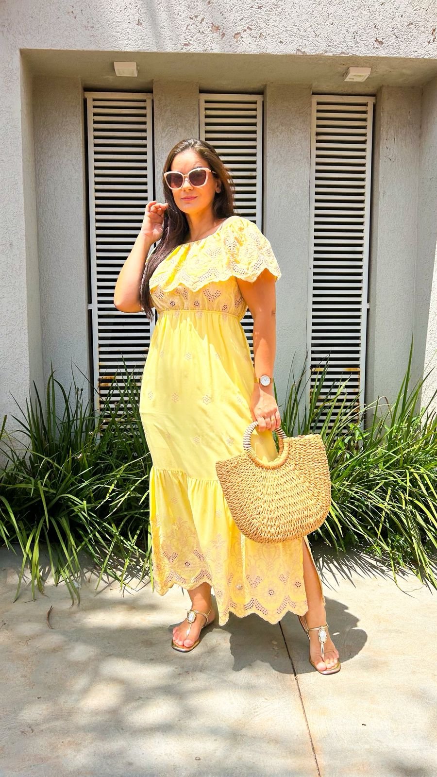 Vestido midi em tom amarelo suave, delicado e cheio de feminilidade, perfeito para dias ensolarados e ocasiões especiais. O modelo traz um visual romântico com detalhes em renda e laise, que enriquecem a peça com um toque sofisticado e leve.