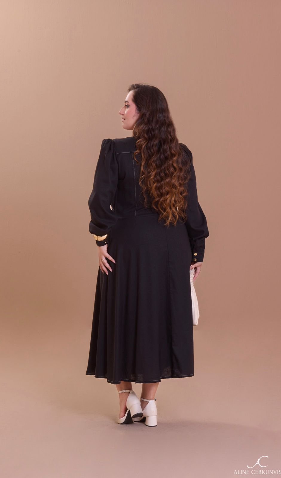Vestido confeccionado no linho com elastano, cor preto e bege, decote redondo