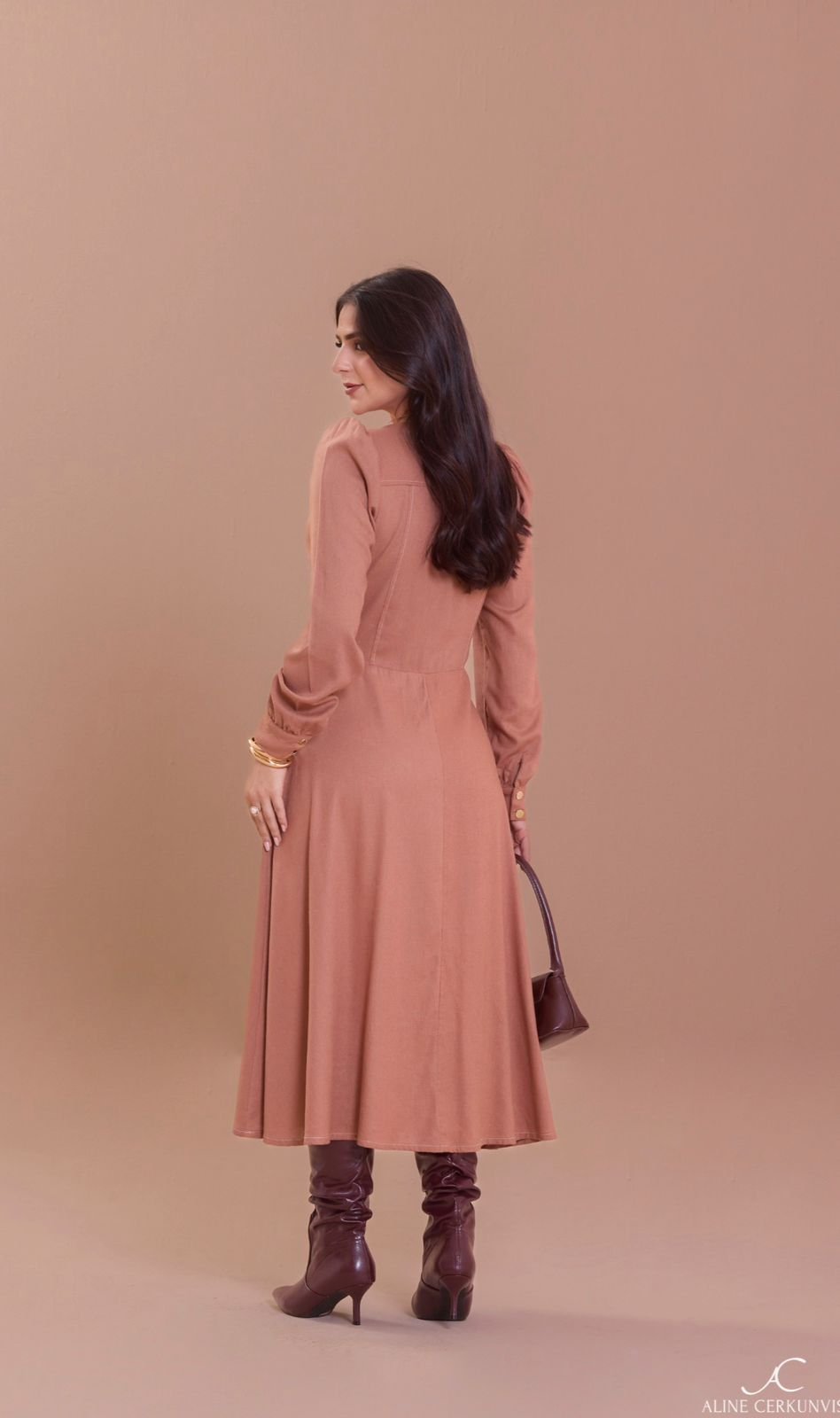e bolsos laterais funcionais, recortes pespontados. Comprimento Maxi Mídi,