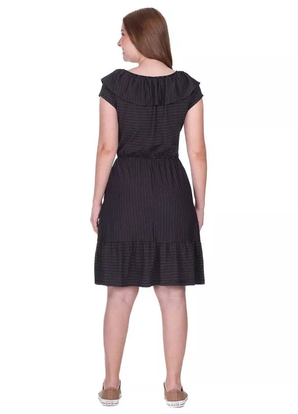 O vestido Paola foi confeccionado em malha listrada. O modelo apresenta decote com elástico interno e babado, fechamento frontal por botões, cintura com elástico interno, detalhe em viés fixo com ponteiras, os bolsos são funcionais. Esse vestido traz muito conforto e uma ótima vestibilidade, sendo um look ideal para o dia a dia.