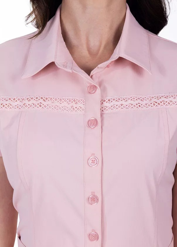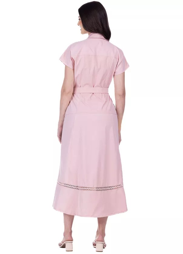 O vestido Patricia foi confeccionado em tecido plano de poliéster. O modelo apresenta decote com gola, fechamento frontal por botões, as mangas são curtas, detalhe em guipir, acompanha faixa com fivela em metal, shape acinturado com a saia em evasê e possui forro anágua. Essa peça traz uma ótima vestibilidade ideal para ocasiões elegantes.