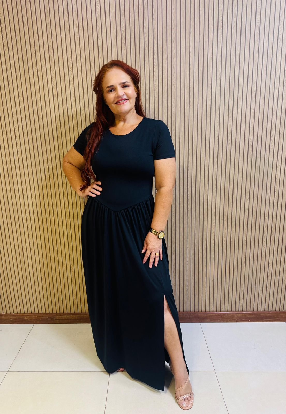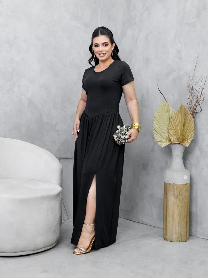 Vestido longo básico e elegante, indispensável no guarda-roupa. Com modelagem confortável e caimento soltinho, ele se adapta ao corpo com leveza, garantindo praticidade no dia a dia. Possui mangas curtas, cintura marcada e fenda lateral que adiciona um toque moderno e feminino ao visual. Versátil, pode ser usado tanto em produções casuais quanto em looks mais sofisticados com a escolha certa de acessórios.