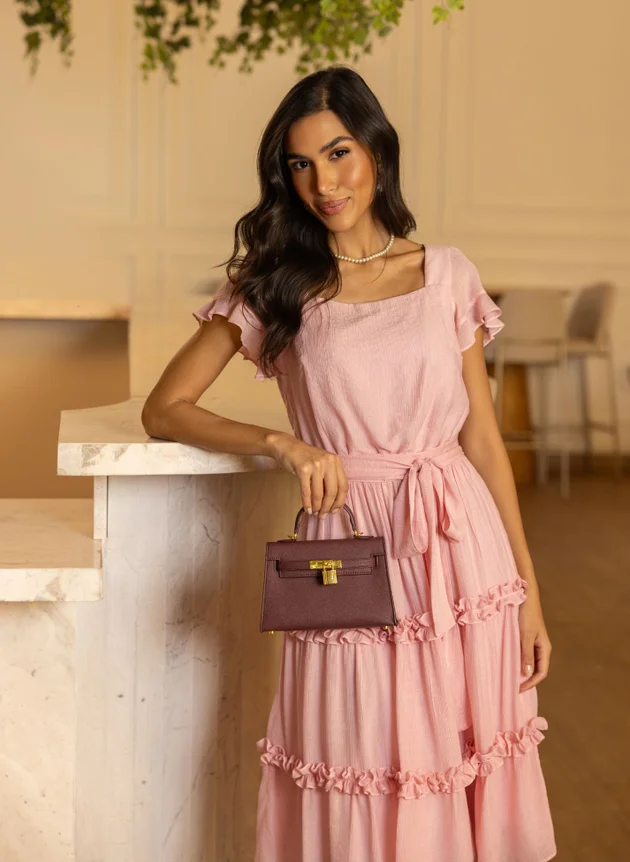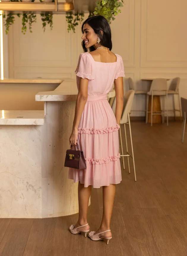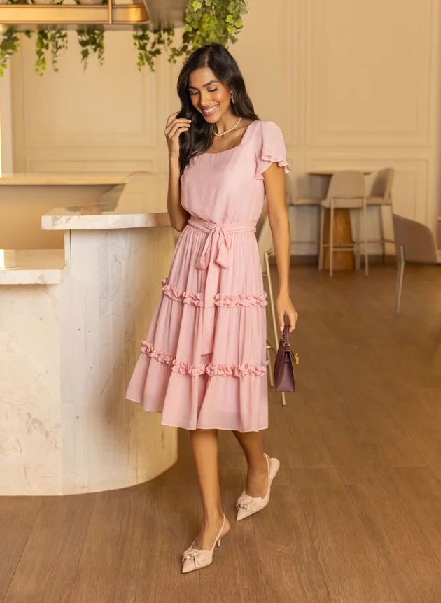Vestido Amanda confeccionado em tecido de visco nylon um tecido com textura, leve e fluido nesse tom de rosa claro delicado e romântico. Um modelo com decote quadrado valorizando o colo feminino com uma manga em recorte godê e pequeno babado, com duas pregas na altura do busto se encaixa perfeitamente ao corpo, sua cintura marcada em elástico acompanha faixa larga para amarrações. Sua saia evasê com sobreposição de mini babados franzido trazendo um charme extra ao look. Um modelo romântico, delicado e cheio de charme que pode ser usado em diversas ocasiões e estações do ano. Aquele look sem erro que vai bem do casual ao formal, use sobreposição para locais mais formais como casacos e blazers. Use e abuse dos acessórios para um visual mais despojado, ou básico elegante que vai bem com peças mais românticas.