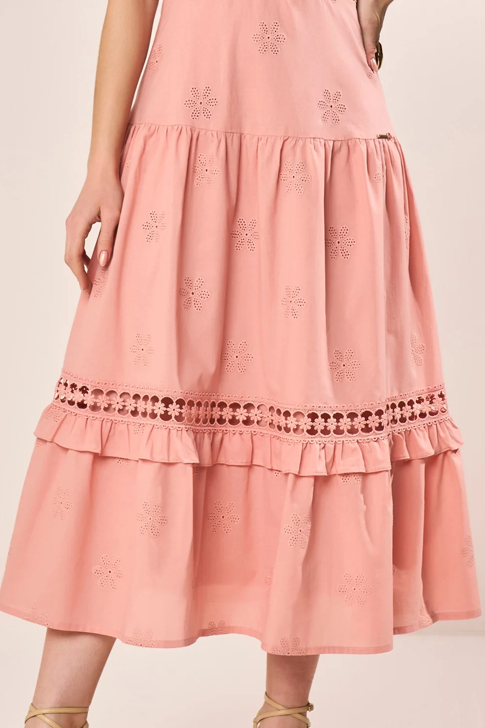 Vestido Rosa Com Flor 3D E Guipir Evasê Midi Fascinius