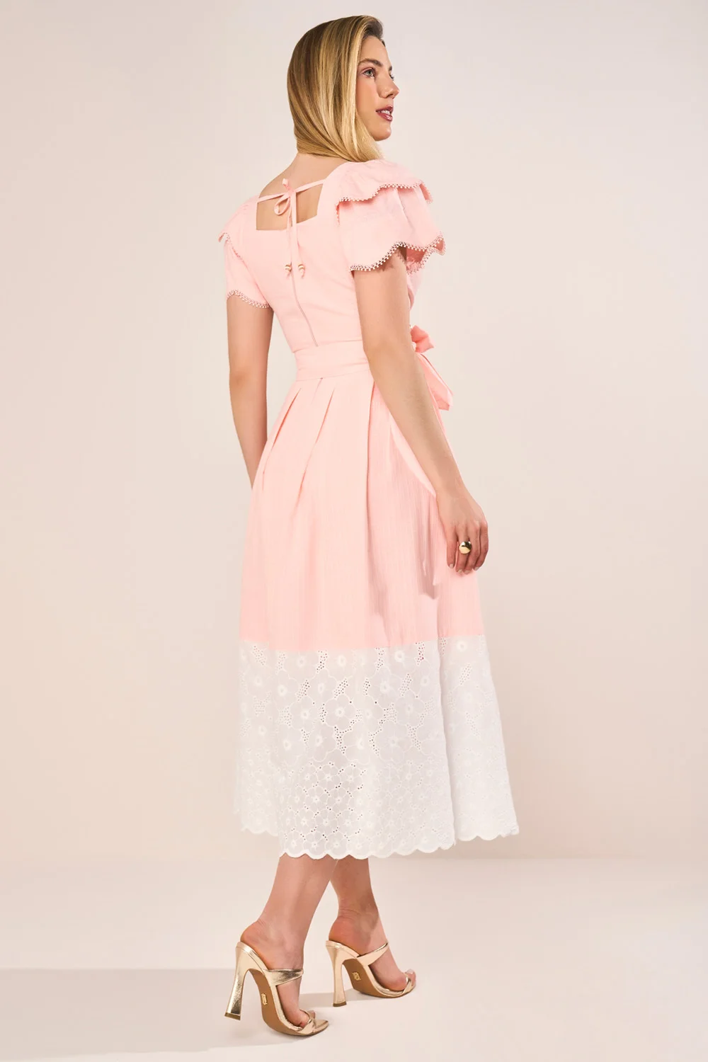 Vestido Rosa Com Laise E Guipir Evasê Midi Fascinius