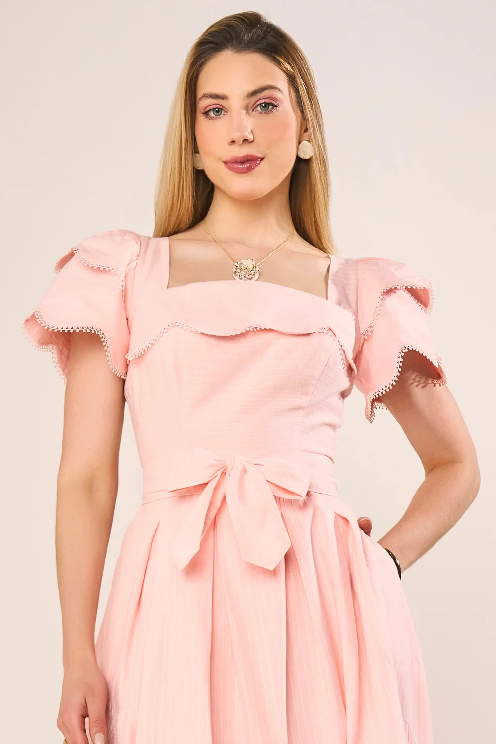 A proposta deste modelo é trazer leveza e charme para o dia a dia, com uma modelagem evasê confortável e fácil de usar. O decote quadrado e as mangas com babadinhos deixam o visual delicado sem exageros, enquanto a amarração nas costas ajuda a ajustar o caimento com praticidade. A saia com pregas e o barrado trabalhado complementam o look, formando um conjunto feminino e versátil em algodão.