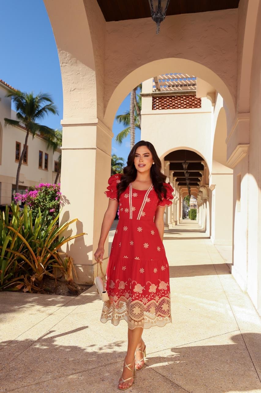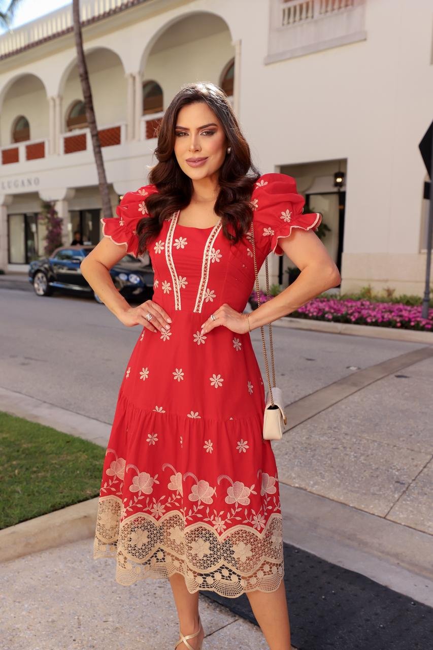 Vestido midi na cambraia bordada, possui decote em v com aplicação de botões encapados não funcionais e renda guipir no busto e na cintura, possui manga bufante com aplicação de elástico no punho formando um babado, saia no modelo evasê com aplicação de 1 maria com barrado do próprio tecido, possui zíper nas costas, possui forro.