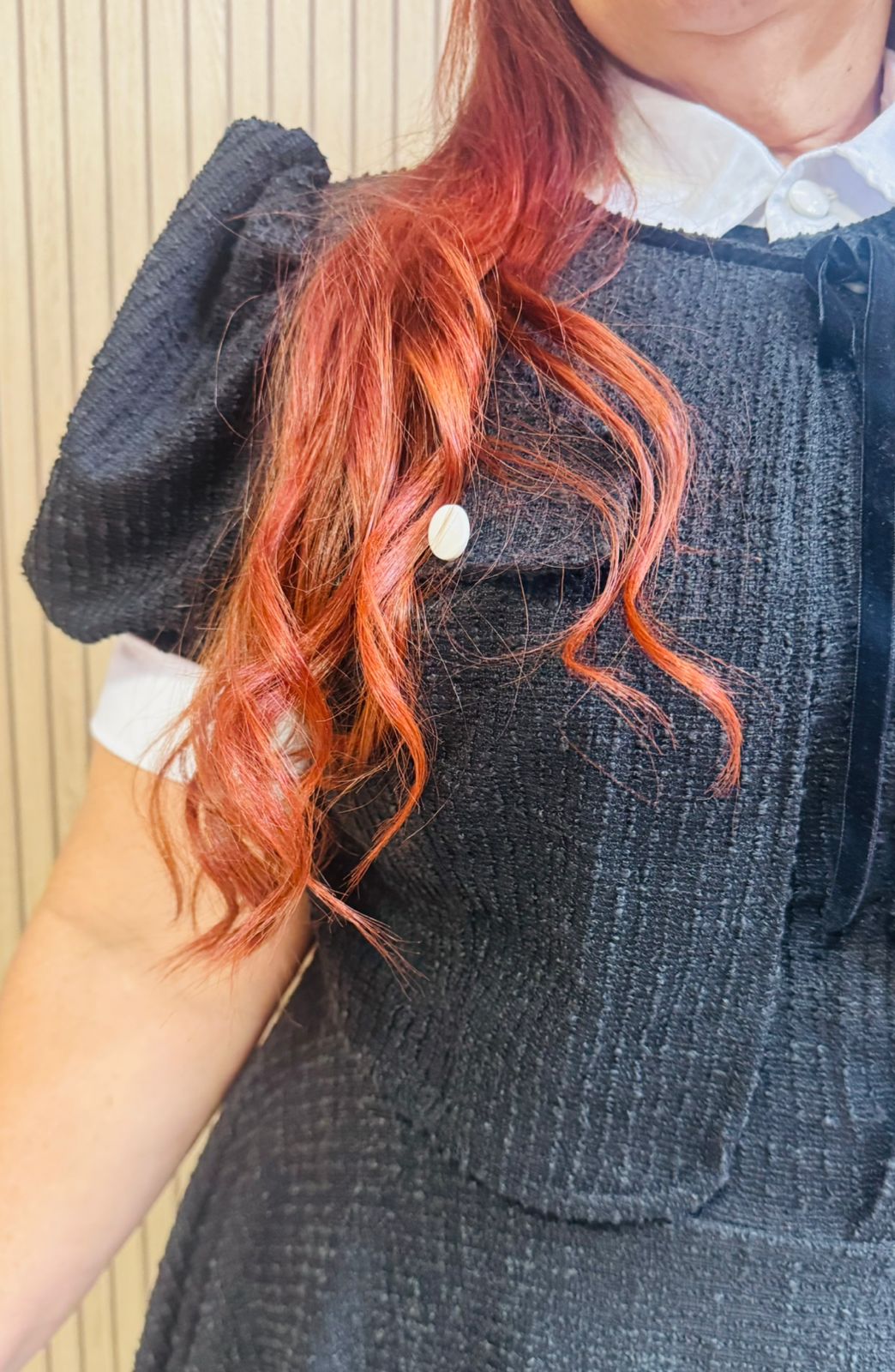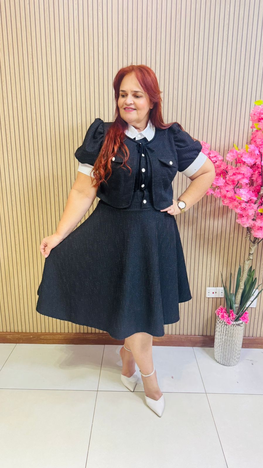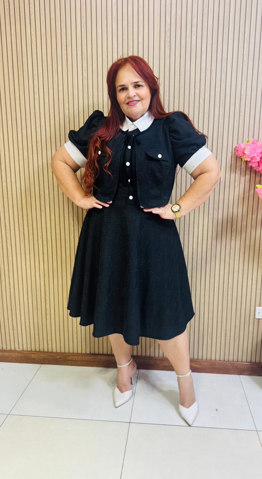 Vestido no modelo Lady Like no tecido de Tweed, possui casaco fake com detalhe de fita de veludo para amarração e lapelas com detalhes de bolso com botão não funcional, possui gola boneca e punho largo no tecido tricoline, possui manga princesa, vestido com botões funcionias, saia no modelo godê, não possui zíper, possui forro.