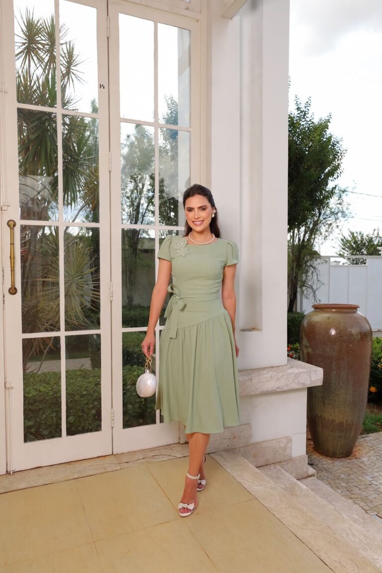 Vestido Midi Evasê Verde com Decote Quadrado e Guipir – Fascinius ref: 302816VD